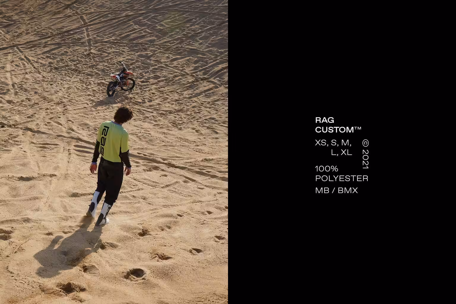 Rag produces customisable jerseys for motocross, BMX, and mountain bikers. Thanks to an innovative short production line, its environmental impact is kept to a minimum. The idea of customization forms the basis of the brand identity, which is made up of some 20 logos, while the brand’s technical expertise is hinted at through curved typographic treatments reminiscent of race tracks and conveyor belts.